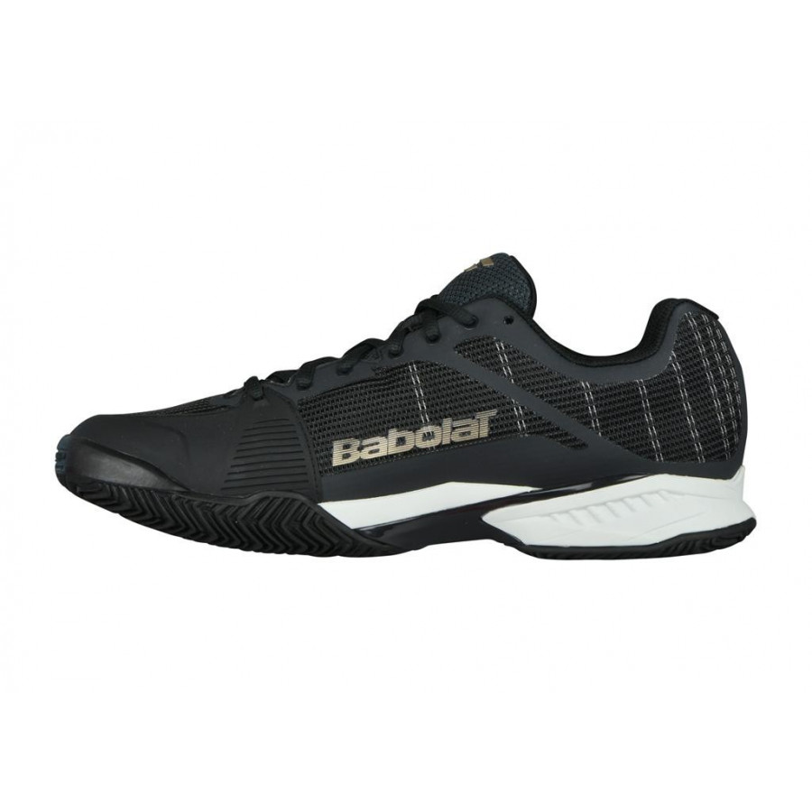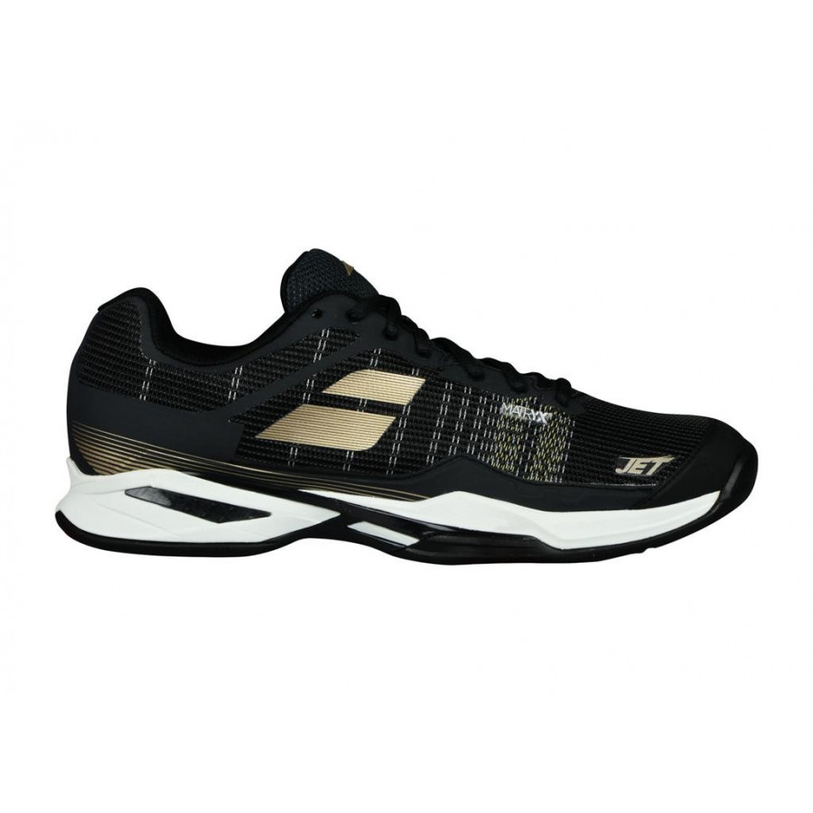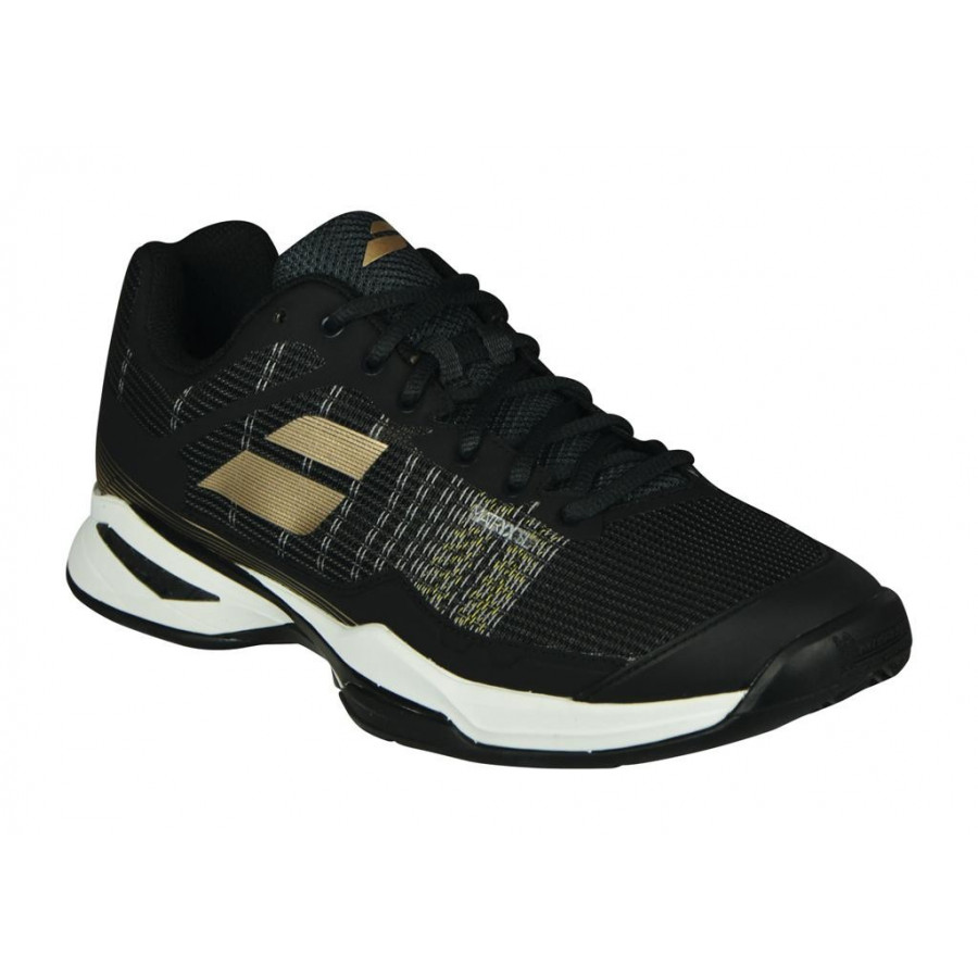 Farba 2031 Black/Gold Pánska tenisová obuv od firmy BABOLAT JET - veľmi ľahká teniska zabezpečuje vysokú pohyblivosť a rýchlosť na všetkých povrchoch kurtov počas hry.
